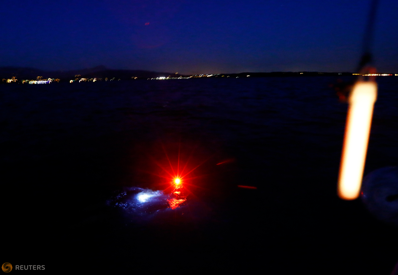 Lights are pictured on swimmer Dirk Gewert during their 70 km relay across Lake Leman from Montreux to Geneva near Yvoire in France near Switzerland August 22, 2017. Picture taken August 22, 2017. REUTERS/Denis Balibouse NO SALES