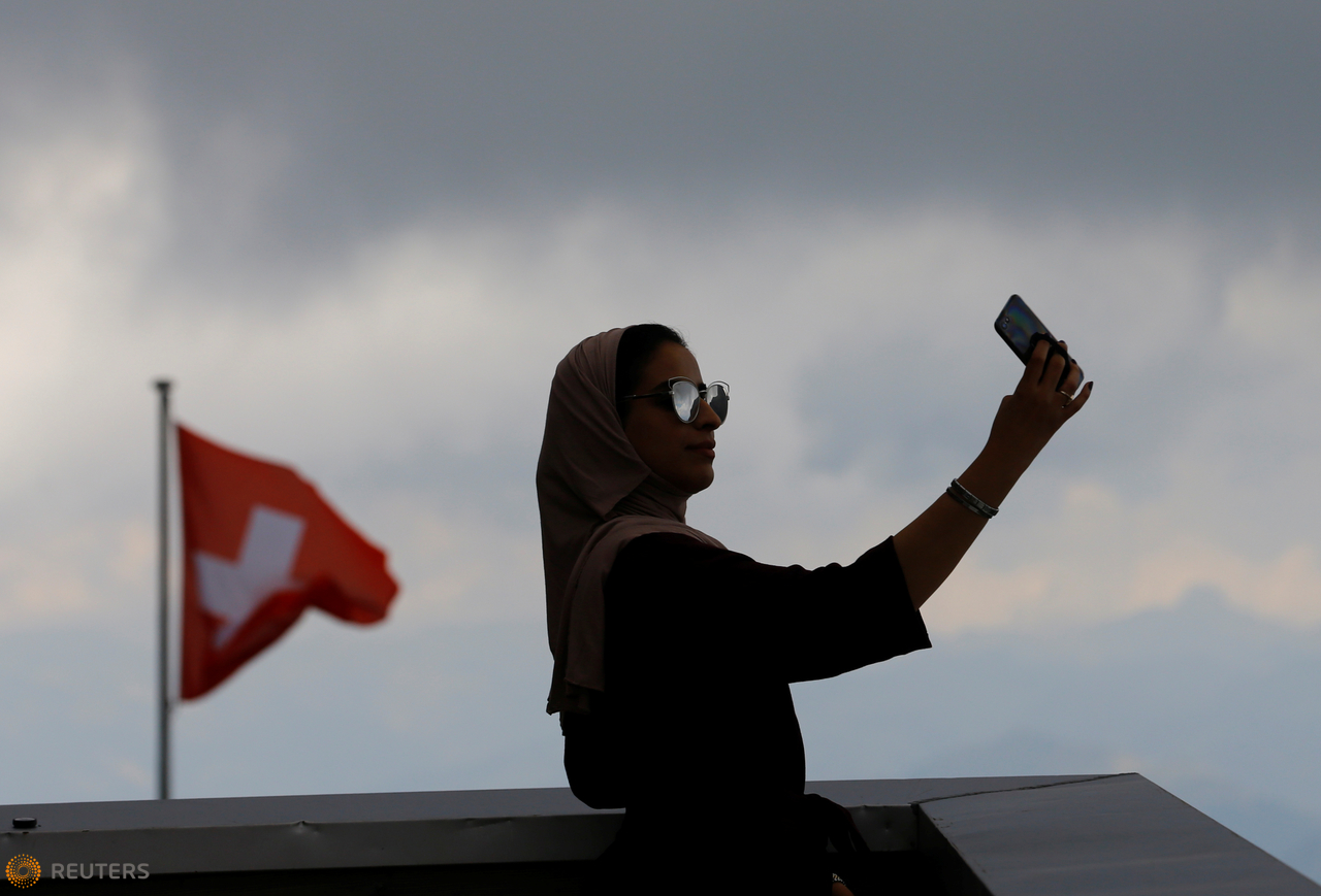 A woman takes a selfie next to a Swiss flag at the Glacier 3000 in Les Diablerets, Switzerland August 4, 2017. REUTERS/Denis Balibouse - RC17D01D0A10