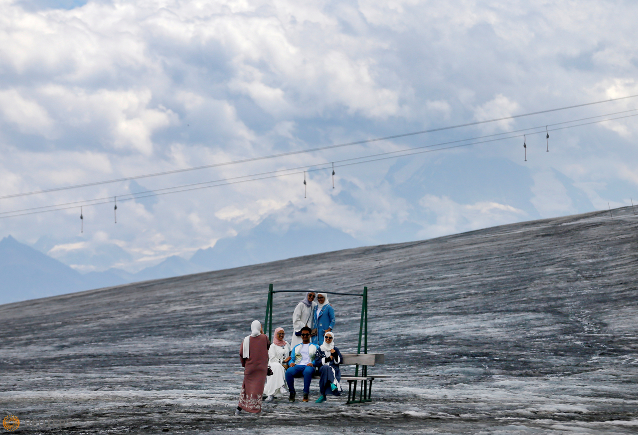Tourists pose for a picture on the Tsanfleuron Glacier at Glacier 3000 in Les Diablerets, Switzerland, August 4, 2017. REUTERS/Denis Balibouse TPX IMAGES OF THE DAY - RC1CEBB05240