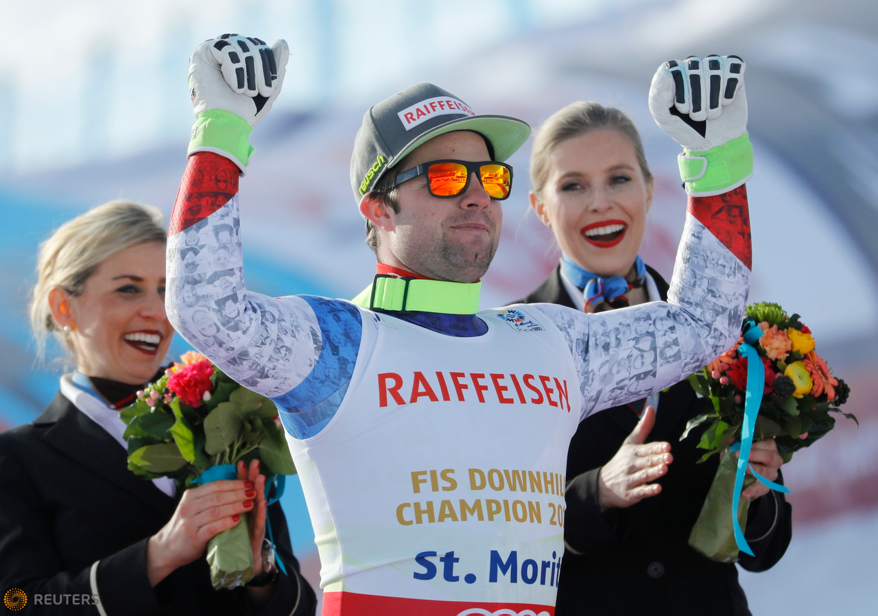 Alpine Skiing - FIS Alpine Skiing World Championships - Men's Downhill - St. Moritz, Switzerland - 12/2/17 - Gold medalist Beat Feuz of Switzerland celebrates during the flower ceremony. REUTERS/Denis Balibouse TPX IMAGES OF THE DAY - LR1ED2C15CYRO