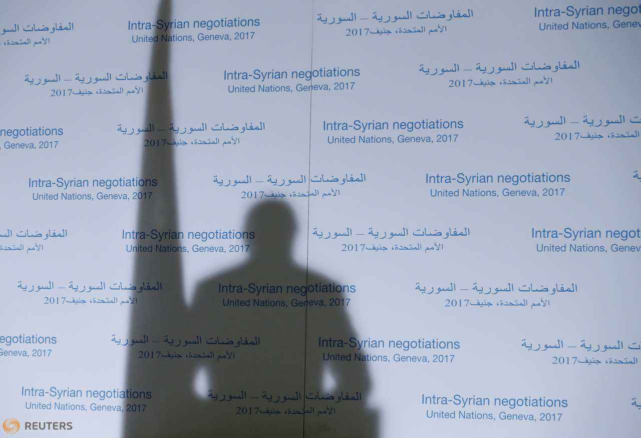 United Nations Special Envoy of the Secretary-General for Syria Staffan de Mistura's shadow is seen at a news conference after meetings during the Intra Syria talks at the European headquarters of the United Nations in Geneva, Switzerland March 24, 2017. REUTERS/Denis Balibouse - RC1FBF8D3630