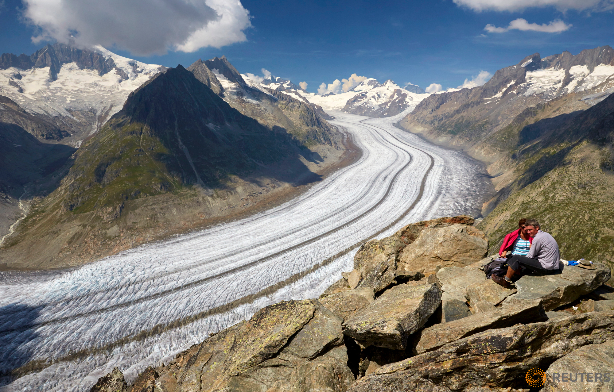Hikers take a rest with a view on the Aletsch Glacier at the Eggishornn summit in Fiesch, Switzerland, August 12, 2015. One of Europe's biggest glaciers, the Great Aletsch coils 23 km (14 miles) through the Swiss Alps - and yet this mighty river of ice could almost vanish in the lifetimes of people born today because of climate change. The glacier, 900 metres (2,950 feet) thick at one point, has retreated about 3 km (1.9 miles) since 1870 and that pace is quickening. REUTERS/Denis Balibouse