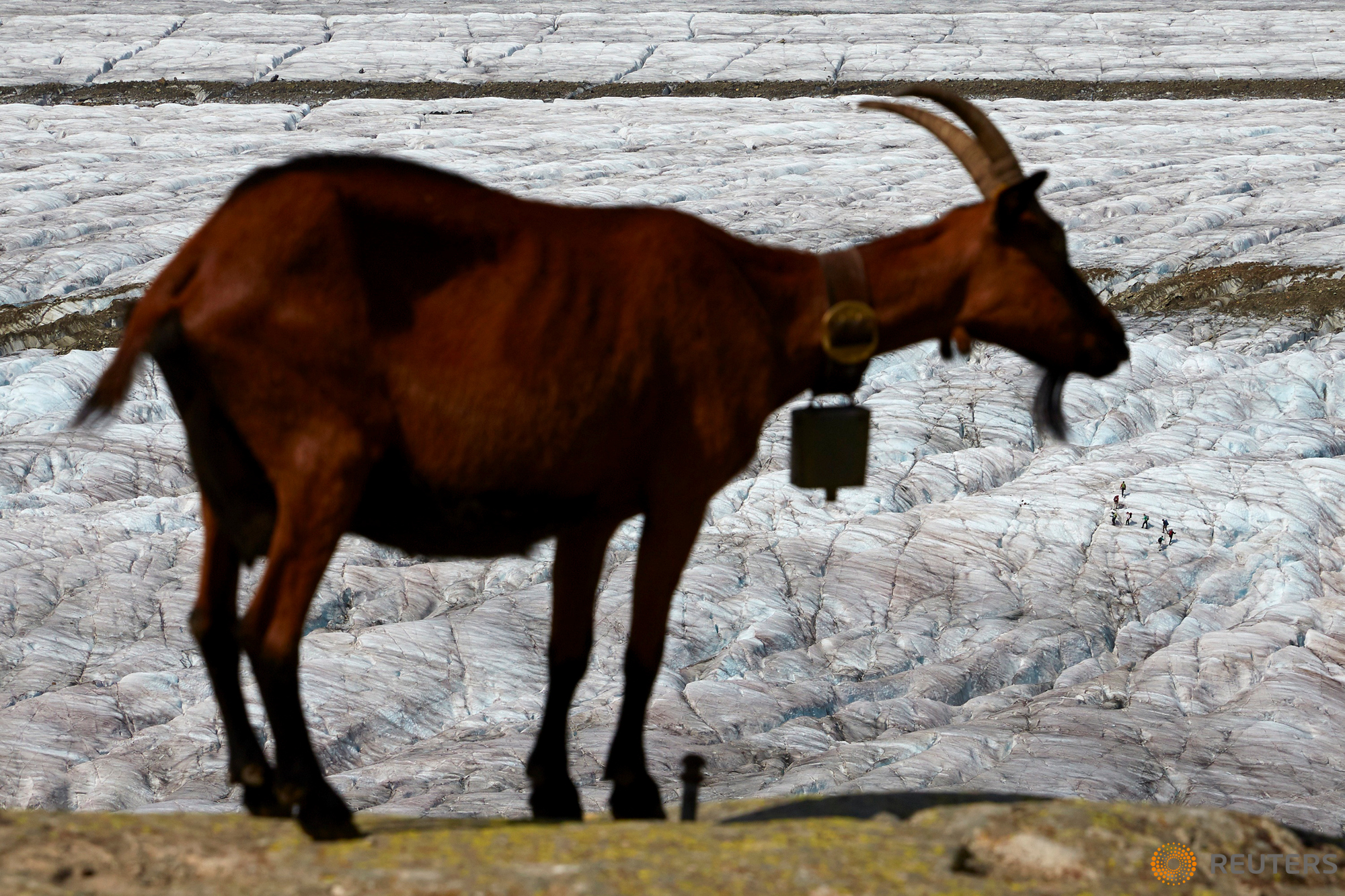 A goat rests at the Platta viewpoint as a group of hikers (background on R) trek in the distance on the Aletsch Glacier in Fiesch, Switzerland, August 12, 2015. One of Europe's biggest glaciers, the Great Aletsch coils 23 km (14 miles) through the Swiss Alps - and yet this mighty river of ice could almost vanish in the lifetimes of people born today because of climate change. The glacier, 900 metres (2,950 feet) thick at one point, has retreated about 3 km (1.9 miles) since 1870 and that pace is quickening. REUTERS/Denis Balibouse