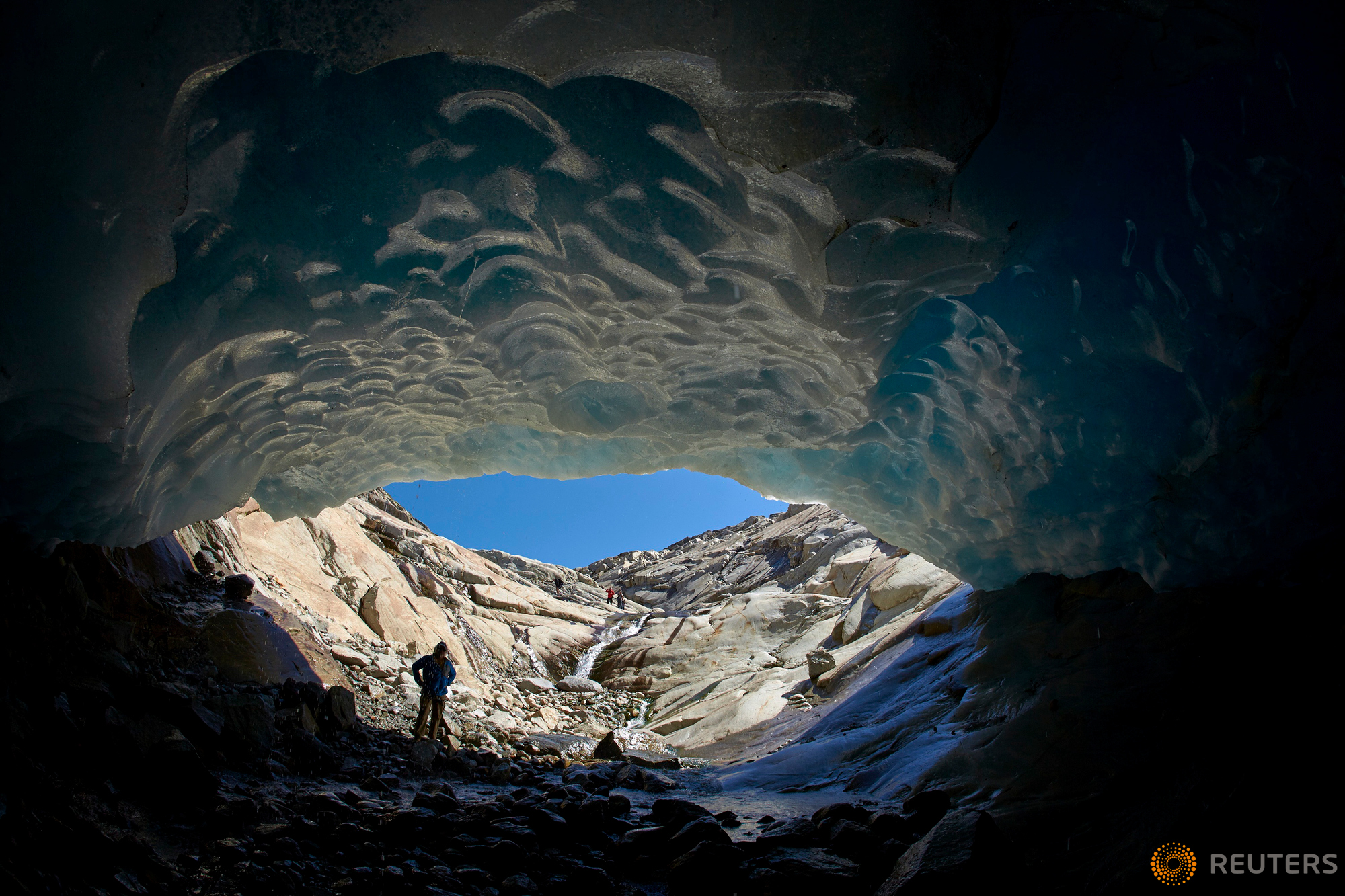 Mountain guide Christian Pletscher stands in a cave on the Aletsch Glacier in Fiesch, Switzerland, August 29, 2015. One of Europe's biggest glaciers, the Great Aletsch coils 23 km (14 miles) through the Swiss Alps - and yet this mighty river of ice could almost vanish in the lifetimes of people born today because of climate change. The glacier, 900 metres (2,950 feet) thick at one point, has retreated about 3 km (1.9 miles) since 1870 and that pace is quickening. REUTERS/Denis Balibouse