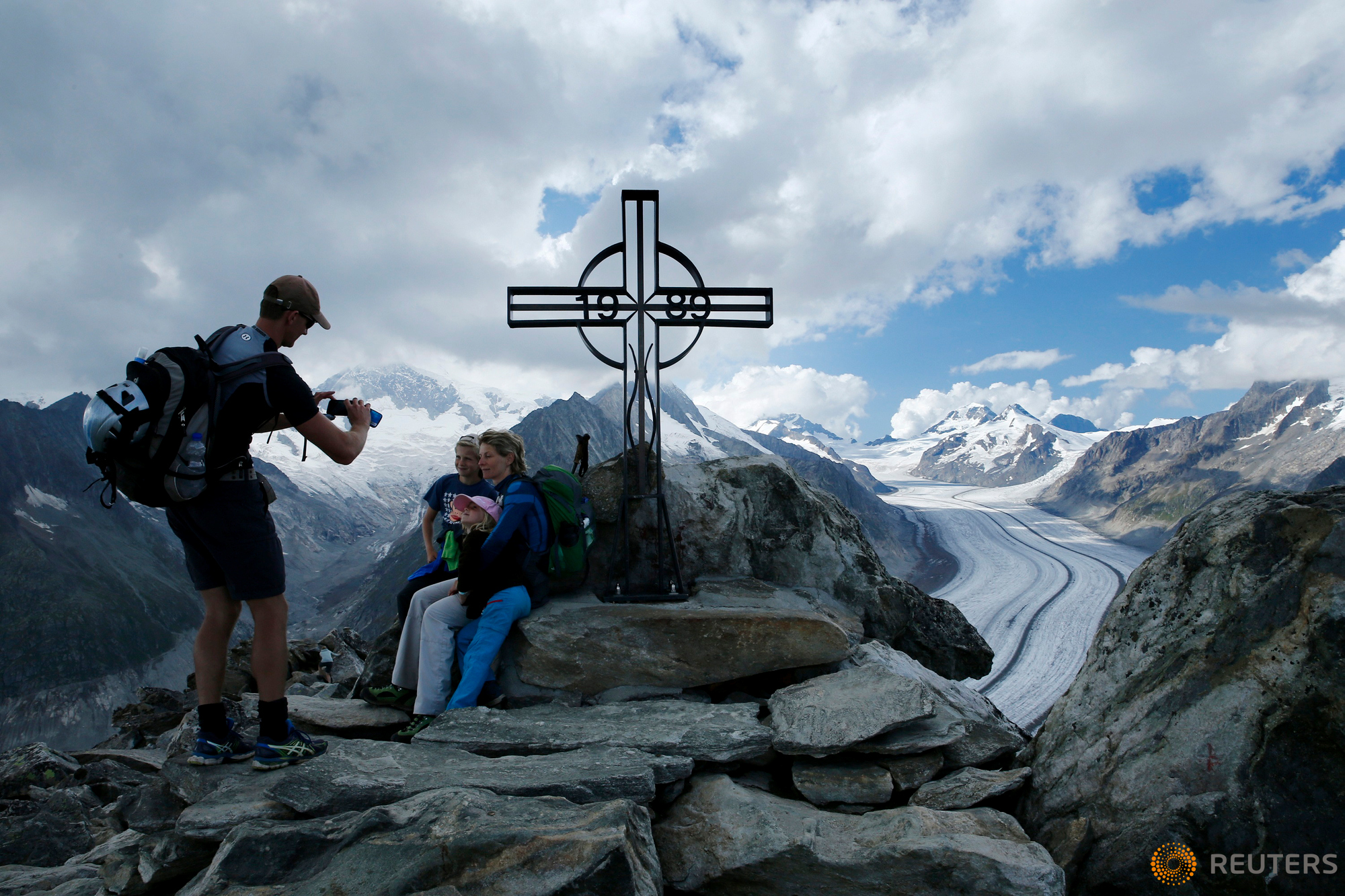 A man takes a picture of his family at the Eggishorn Summit with the Aletsch Glacier in the background in Fiesch, Switzerland, August 22, 2015. One of Europe's biggest glaciers, the Great Aletsch coils 23 km (14 miles) through the Swiss Alps - and yet this mighty river of ice could almost vanish in the lifetimes of people born today because of climate change. The glacier, 900 metres (2,950 feet) thick at one point, has retreated about 3 km (1.9 miles) since 1870 and that pace is quickening. REUTERS/Denis Balibouse