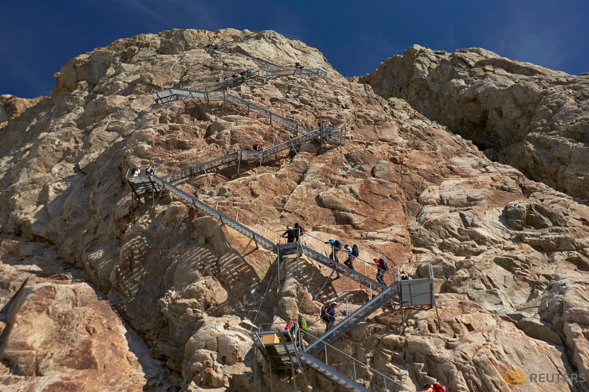 Hikers climb the 460 steps up to the Konkordia Hut on the Aletsch Glacier, Switzerland, August 28, 2015. One of Europe's biggest glaciers, the Great Aletsch coils 23 km (14 miles) through the Swiss Alps - and yet this mighty river of ice could almost vanish in the lifetimes of people born today because of climate change. The glacier, 900 metres (2,950 feet) thick at one point, has retreated about 3 km (1.9 miles) since 1870 and that pace is quickening. REUTERS/Denis Balibouse