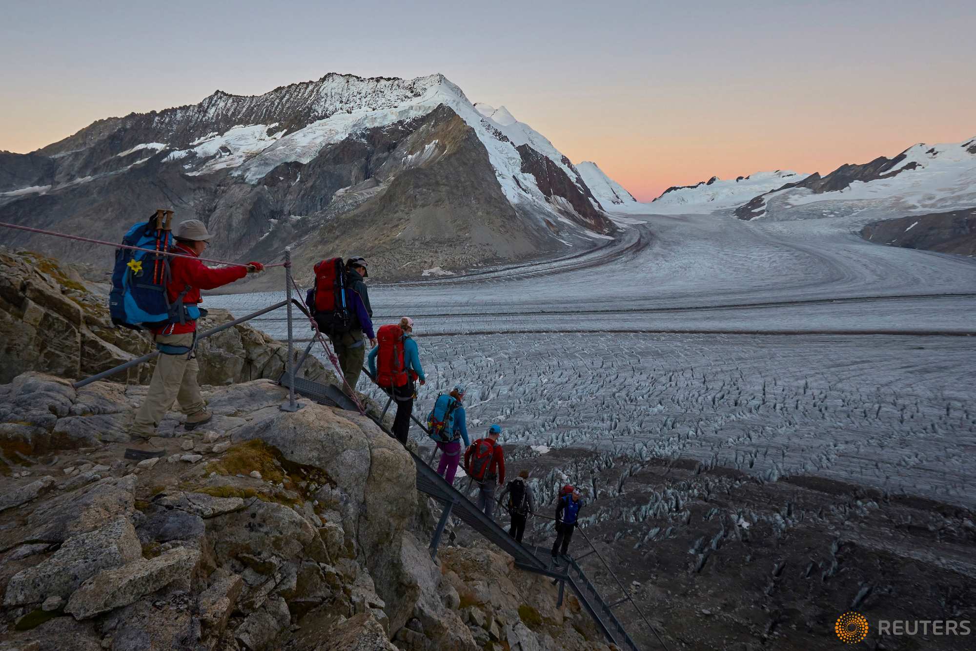 Hikers walk down steps onto the Aletsch Glacier, Switzerland, August 29, 2015. One of Europe's biggest glaciers, the Great Aletsch coils 23 km (14 miles) through the Swiss Alps - and yet this mighty river of ice could almost vanish in the lifetimes of people born today because of climate change. The glacier, 900 metres (2,950 feet) thick at one point, has retreated about 3 km (1.9 miles) since 1870 and that pace is quickening. REUTERS/Denis Balibouse