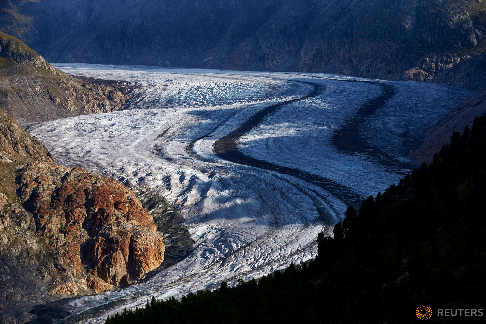 The Aletsch Glacier is pictured in Riederalp, Switzerland, August 23, 2015. One of Europe's biggest glaciers, the Great Aletsch coils 23 km (14 miles) through the Swiss Alps - and yet this mighty river of ice could almost vanish in the lifetimes of people born today because of climate change. The glacier, 900 metres (2,950 feet) thick at one point, has retreated about 3 km (1.9 miles) since 1870 and that pace is quickening. REUTERS/Denis Balibouse