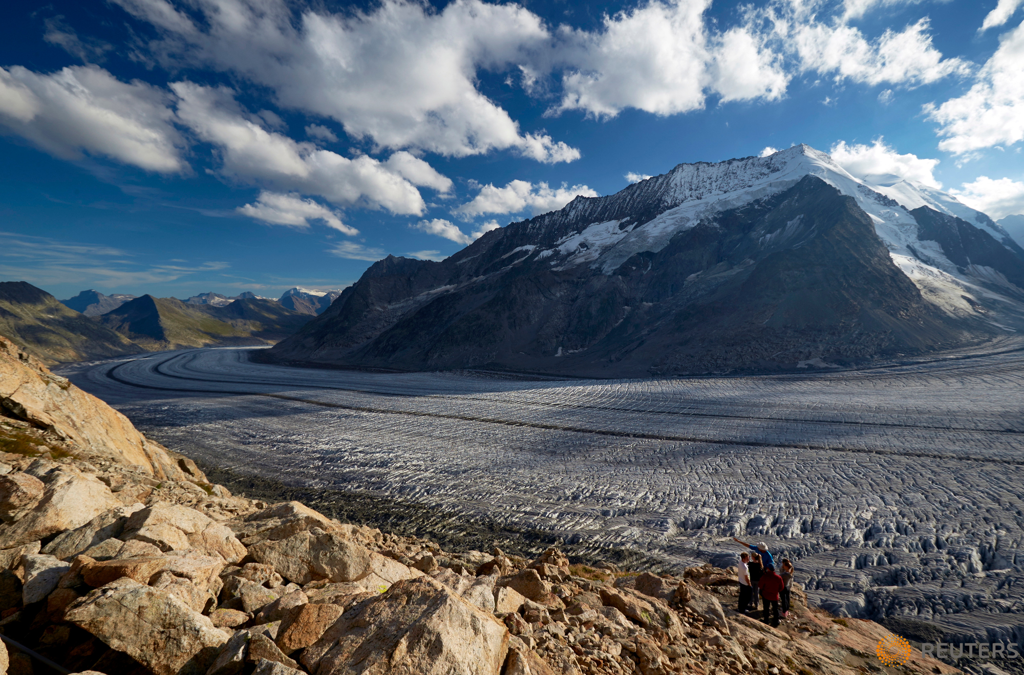 A mountain guide shows his clients the landscape at the Konkordia Hut over the Aletsch Glacier, Switzerland, August 28, 2015. One of Europe's biggest glaciers, the Great Aletsch coils 23 km (14 miles) through the Swiss Alps - and yet this mighty river of ice could almost vanish in the lifetimes of people born today because of climate change. The glacier, 900 metres (2,950 feet) thick at one point, has retreated about 3 km (1.9 miles) since 1870 and that pace is quickening. REUTERS/Denis Balibouse