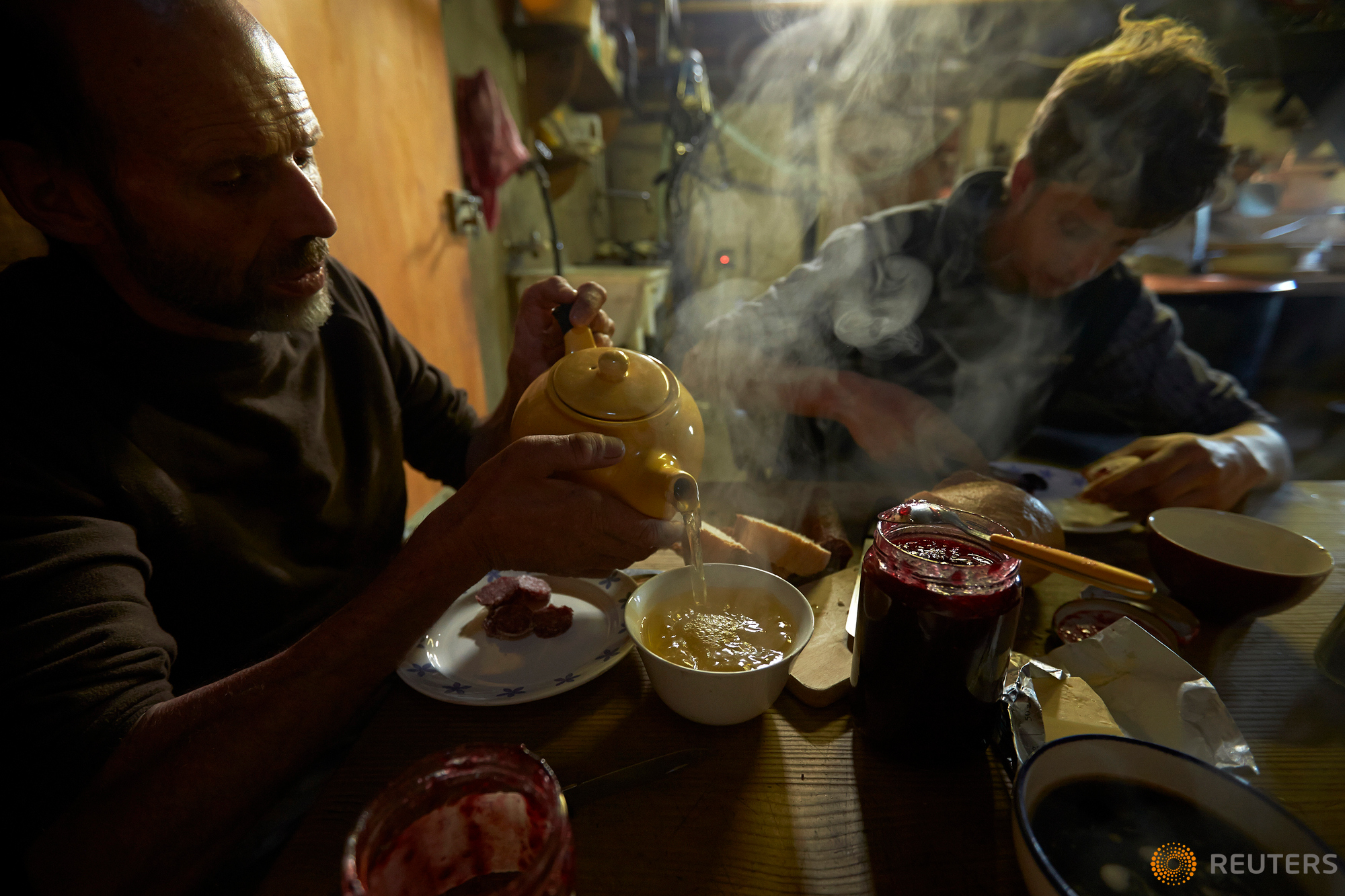 Cheese maker and farmer Jacques Murith pours a tea next to his son Alexandre during breakfast at the Proveta pasture in Gruyeres, western Switzerland, June 13, 2013. During the summer grazing season, starting mid-May to mid-October, the fifth generation Murith family produce a distinctive mountain pasture Gruyere cheese. Each wheel of cheese weighs between 25-40 kilograms, and takes a minimum of six months to mature. Some 200 wheels are produced each year from the unpasteurized milk from his herd of cows and sold locally. REUTERS/Denis Balibouse