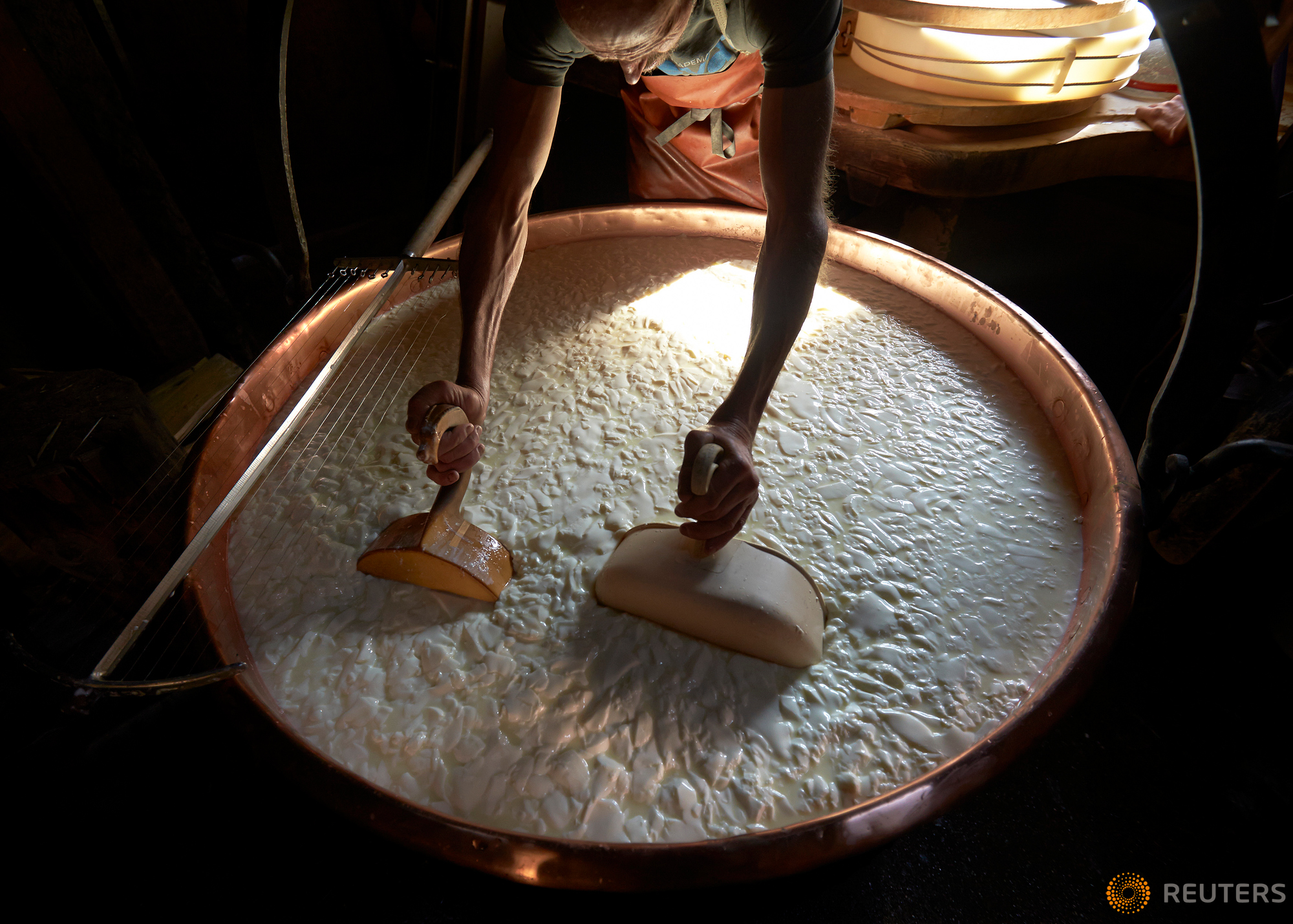 Cheese maker and farmer Jacques Murith splits the curds during cheese making process at the Tsermon mountain pasture chalet in Gruyeres, western Switzerland, July 10, 2013. During the summer grazing season, starting mid-May to mid-October, the fifth generation Murith family produce a distinctive mountain pasture Gruyere cheese. Each wheel of cheese weighs between 25-40 kilograms, and takes a minimum of six months to mature. Some 200 wheels are produced each year from the unpasteurized milk from his herd of cows and sold locally. REUTERS/Denis Balibouse