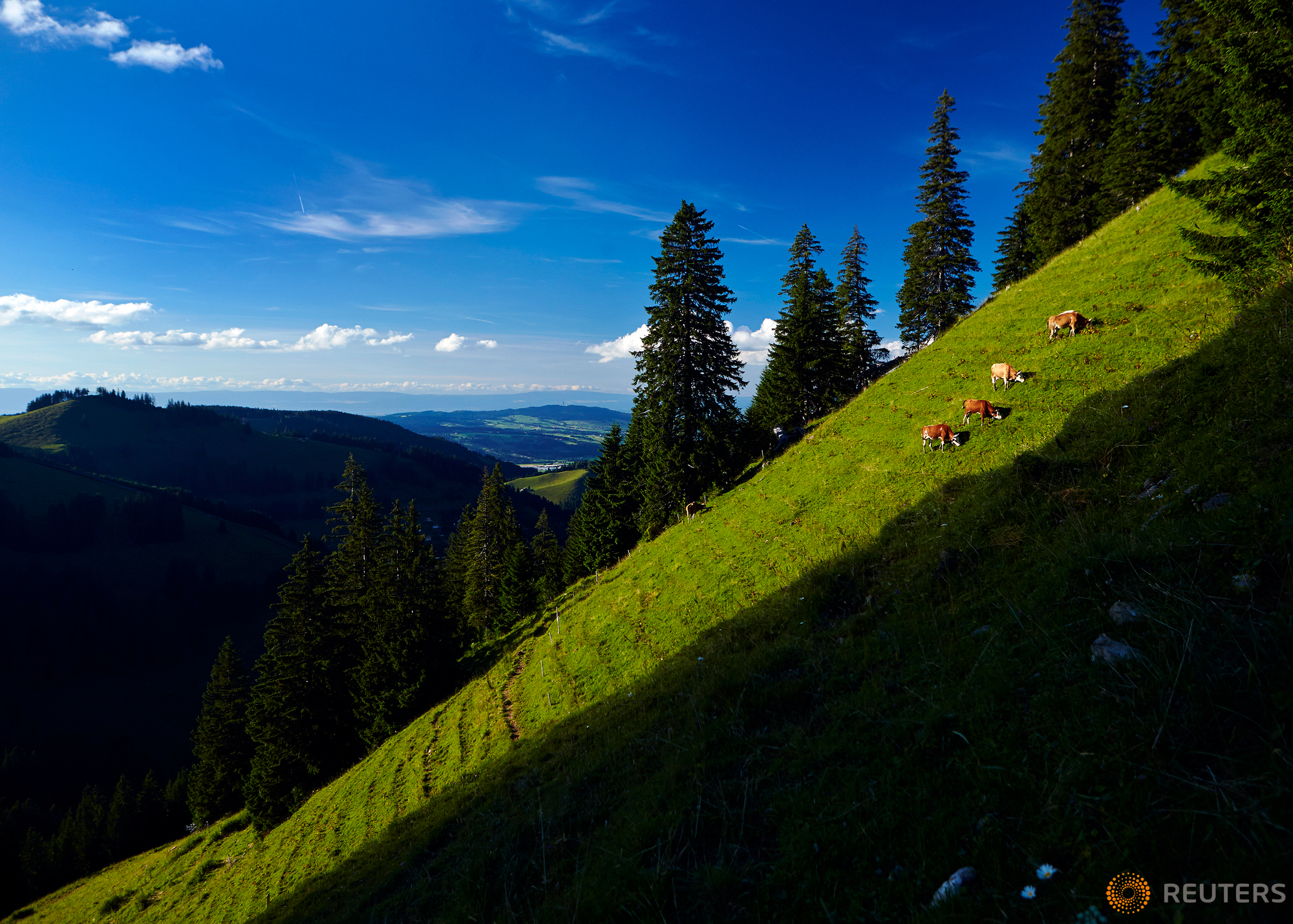 Cows are pictured in a field at the Tsermon mountain pasture in Gruyeres, western Switzerland, July 30, 2013. During the summer grazing season, starting mid-May to mid-October, the fifth generation Murith family produce a distinctive mountain pasture Gruyere cheese. Each wheel of cheese weighs between 25-40 kilograms, and takes a minimum of six months to mature. Some 200 wheels are produced each year from the unpasteurized milk from his herd of cows and sold locally. REUTERS/Denis Balibouse