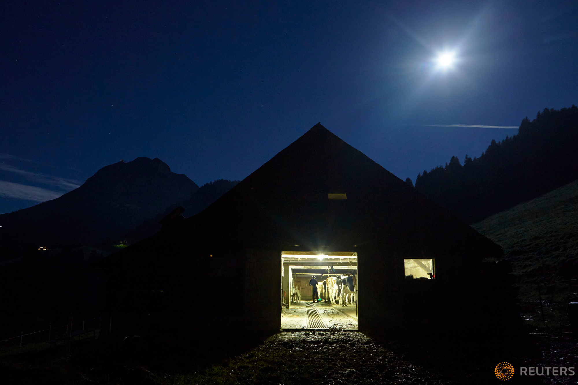 Cheese maker and farmer Alexandre Murith milks the cows at La Proveta mountain pasture chalet on a full moon morning in Gruyeres, western Switzerland, September 20, 2013. During the summer grazing season, starting mid-May to mid-October, the fifth generation Murith family produce a distinctive mountain pasture Gruyere cheese. Each wheel of cheese weighs between 25-40 kilograms, and takes a minimum of six months to mature. Some 200 wheels are produced each year from the unpasteurized milk from his herd of cows and sold locally. REUTERS/Denis Balibouse