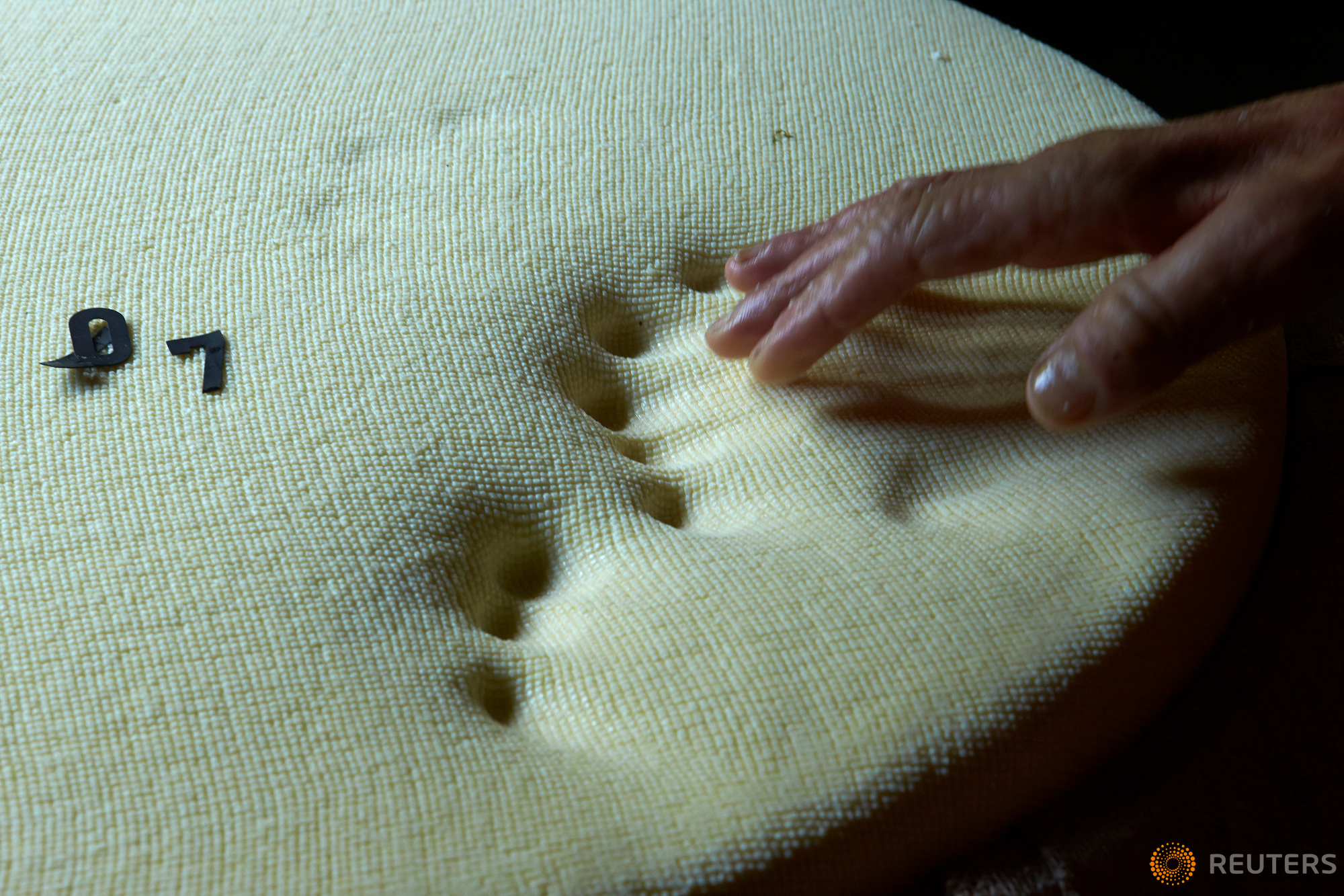 Cheese maker and farmer Jacques Murith checks with his fingers the cohesion of the newly made cheese at the Tsermon mountain pasture chalet in Gruyeres, western Switzerland, July 10, 2013. During the summer grazing season, starting mid-May to mid-October, the fifth generation Murith family produce a distinctive mountain pasture Gruyere cheese. Each wheel of cheese weighs between 25-40 kilograms, and takes a minimum of six months to mature. Some 200 wheels are produced each year from the unpasteurized milk from his herd of cows and sold locally. REUTERS/Denis Balibouse