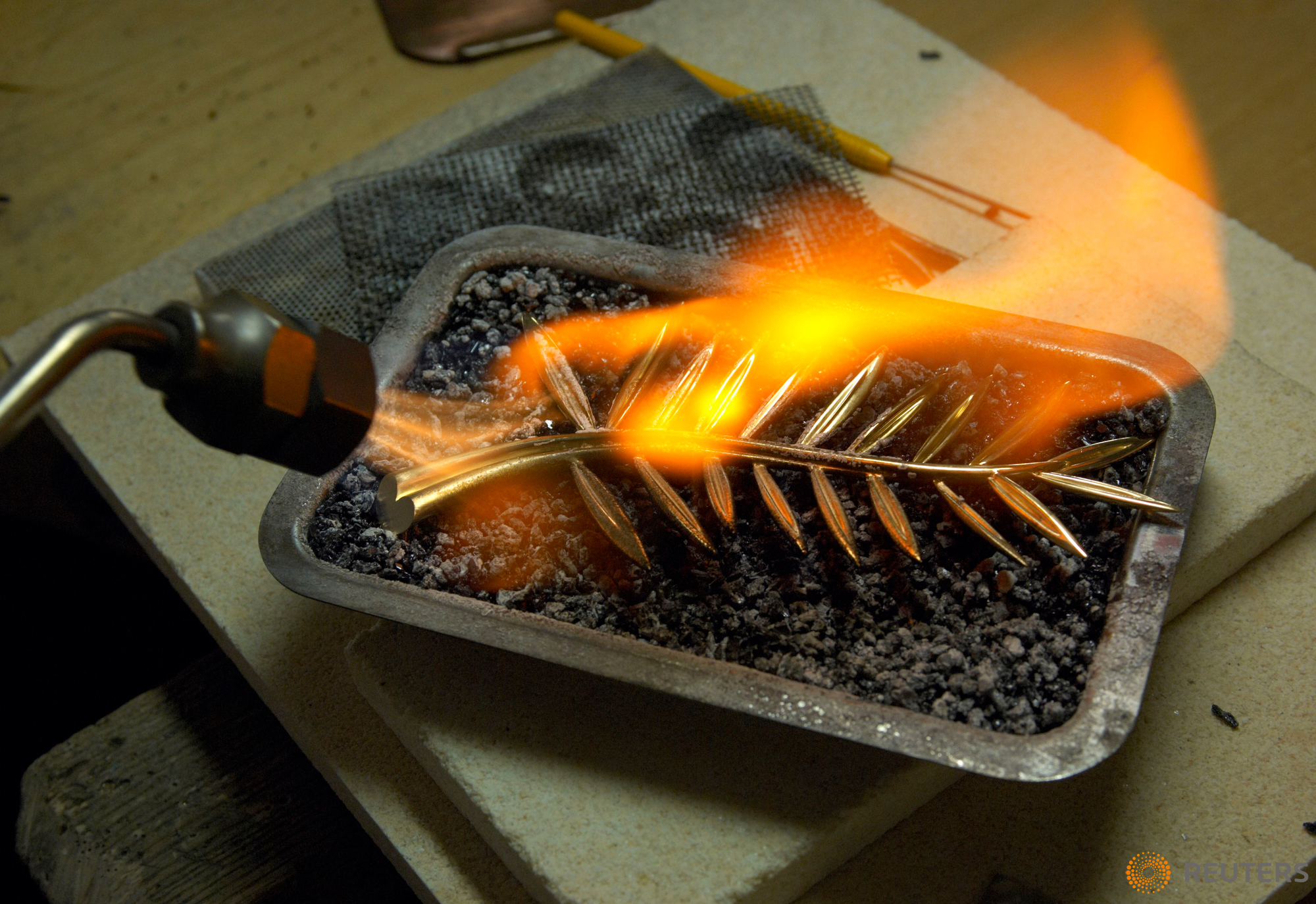 Chopard Chief jeweller Marc Couttet heats the Palme d'Or trophy for the Cannes Film Festival with a blowtorch at the company's headquarters in Geneva, Switzerland, April 26, 2006. Since 1998 Chopard manufactures the handmade Palme d'Or (Golden Palm). It is made out of 18-carat gold and will be awarded to the director of the Best Feature Film of the Official Competition at the 59th Cannes Film Festival which will take place on the French Mediterranean coast May 17 to 28, 2006. REUTERS/Denis Balibouse -