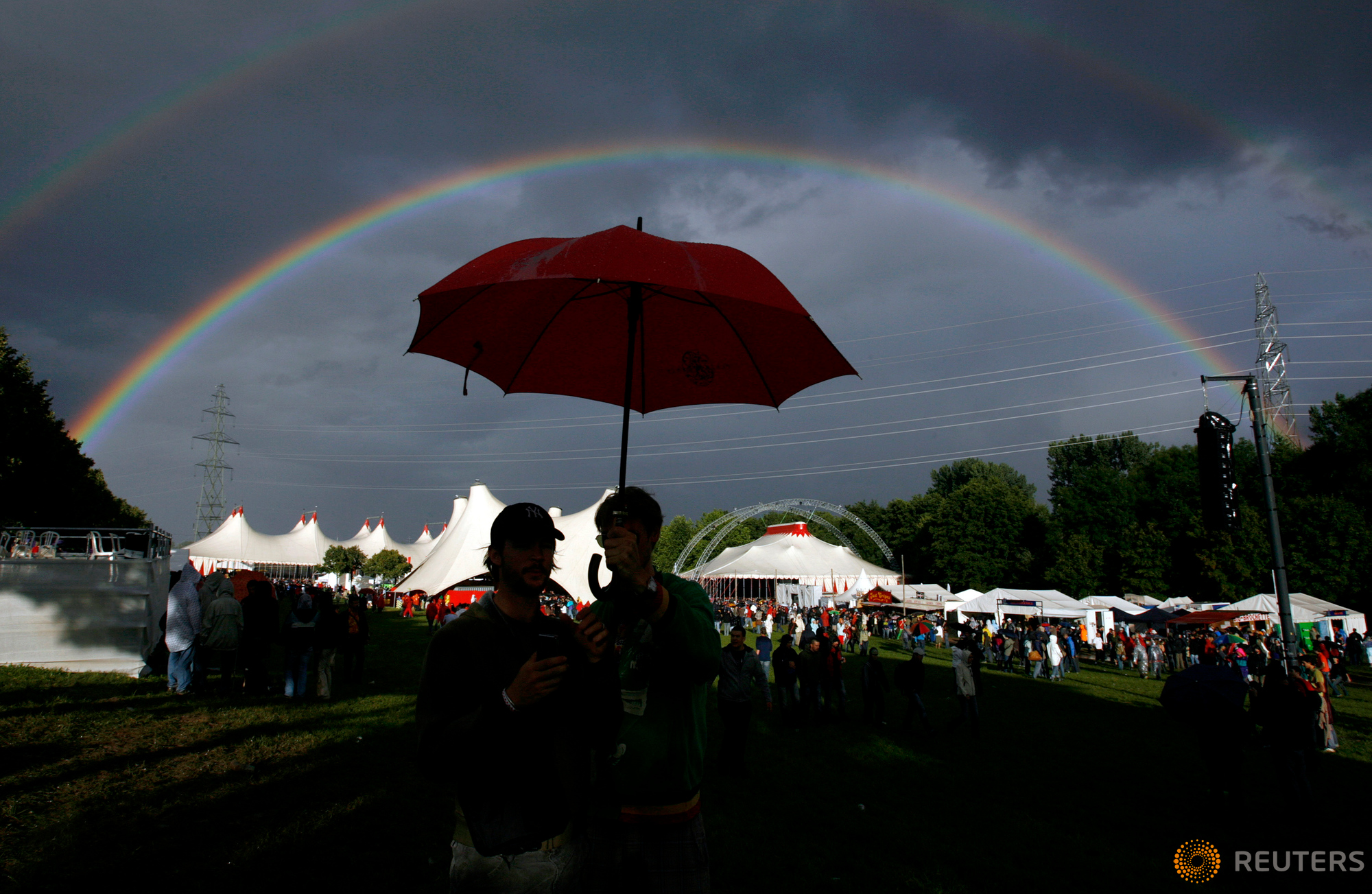 Revellers walk with an umbrella during rainfall at the Paleo Music Festival in Nyon July 24, 2007. REUTERS/Denis Balibouse