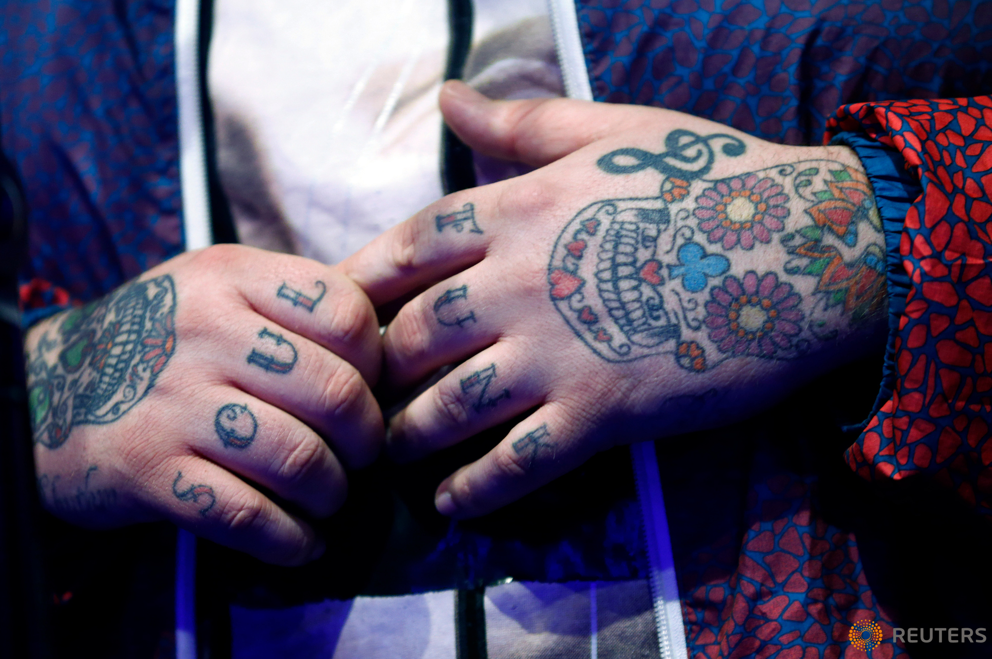Tattoos are pictured on the hands of Rory Graham lead singer of British band Rag'n'Bone during his set at a news conference in Montreux, Switzerland, April 14, 2016. The Montreux Jazz Festival celebrates from June 30 to July 16, 2016 its 50th anniversary this year with a jubilee line-up featuring legends Van Morrison, Herbie Hancock, Patti Smith, Marcus Miller, Neil Young, Lana Del Rey, Jamie Cullum, Santana and Deep Purple. REUTERS/Denis Balibouse