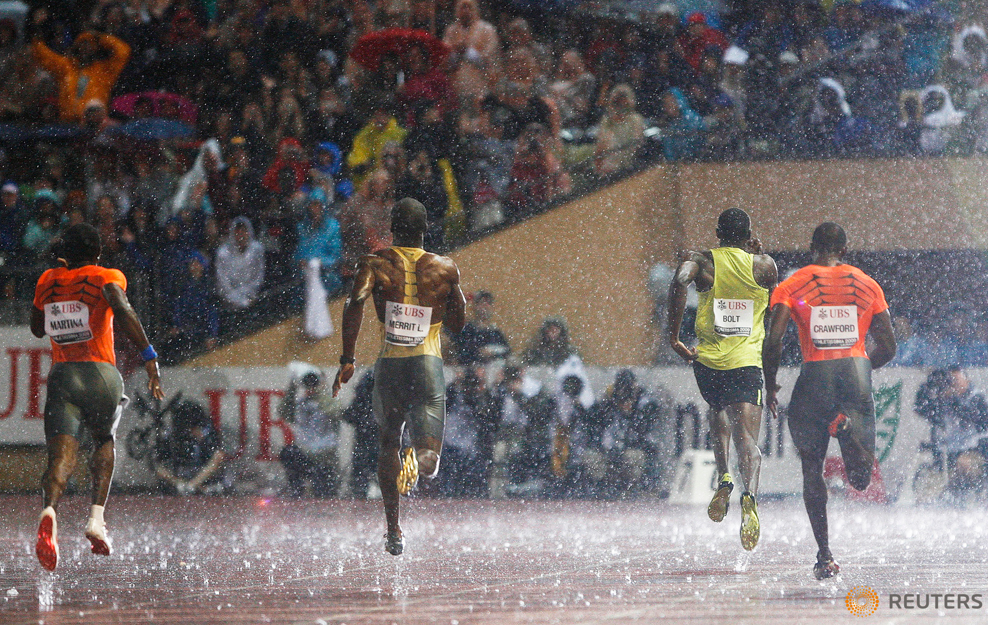 Usain Bolt of Jamaica (2nd R) runs to win the men's 200 metres race next to Churandy Martina of the Netherlands Antilles, LaShawn Merritt of the U.S. and Shawn Crawford of the U.S. (L-R) during the Super Grand Prix athletics meeting at the Stade Olympique in Lausanne July 7, 2009 REUTERS/Denis Balibouse