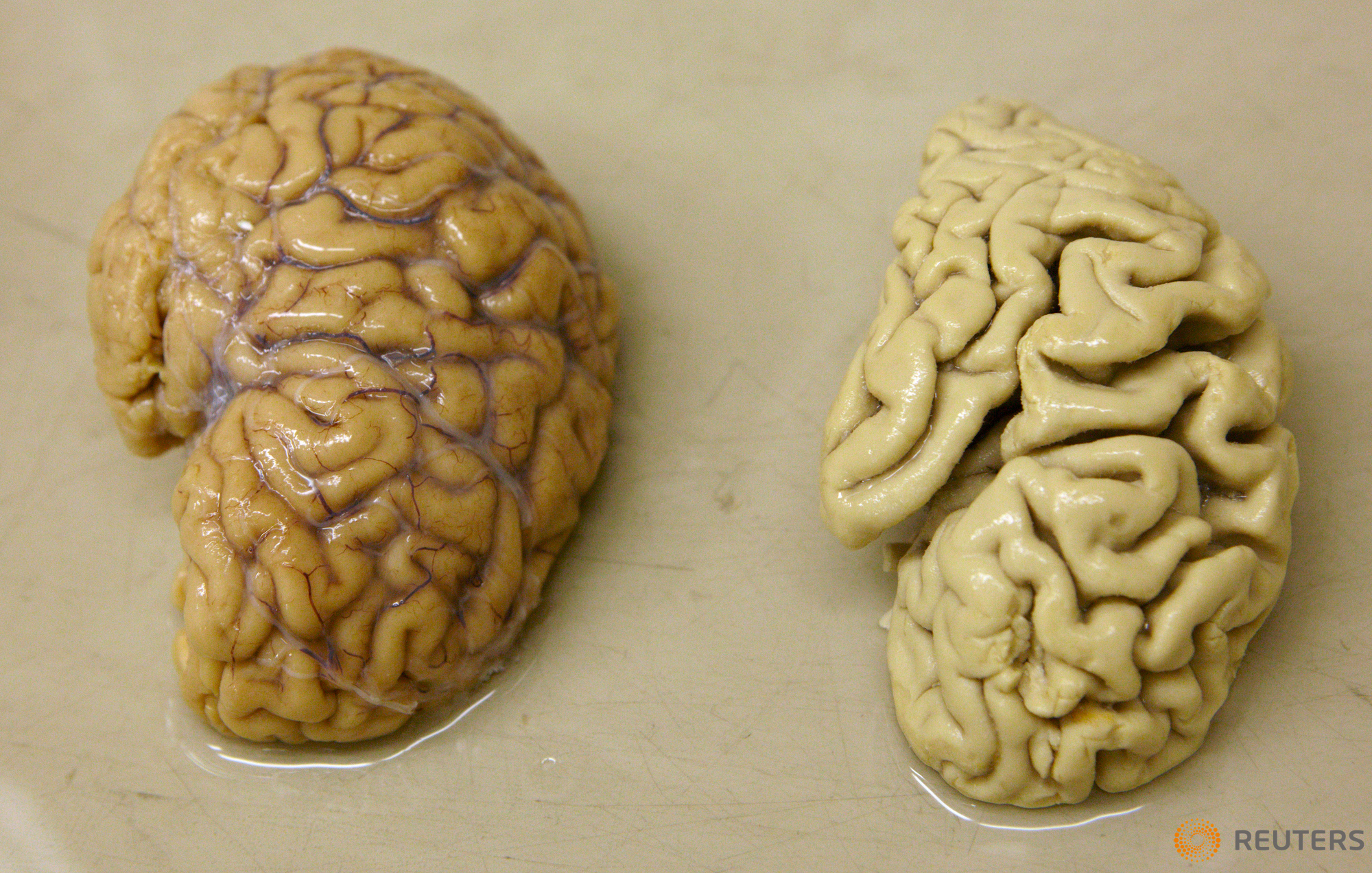 One hemisphere of a healthy brain (L) is pictured next to one hemisphere of a brain of a person suffering from Alzheimer disease, at the Morphological unit of psychopathology in the Neuropsychiatry division of the Belle Idee University Hospital in Chene-Bourg near Geneva March 14, 2011. The Division stores more than 11,000 human brains from since the early 20th century for teaching and research. Brain Awareness Week, which takes places March 14 to 18, 2011, is the global campaign to increase public awareness about the progress and benefits of brain research. REUTERS/Denis Balibouse