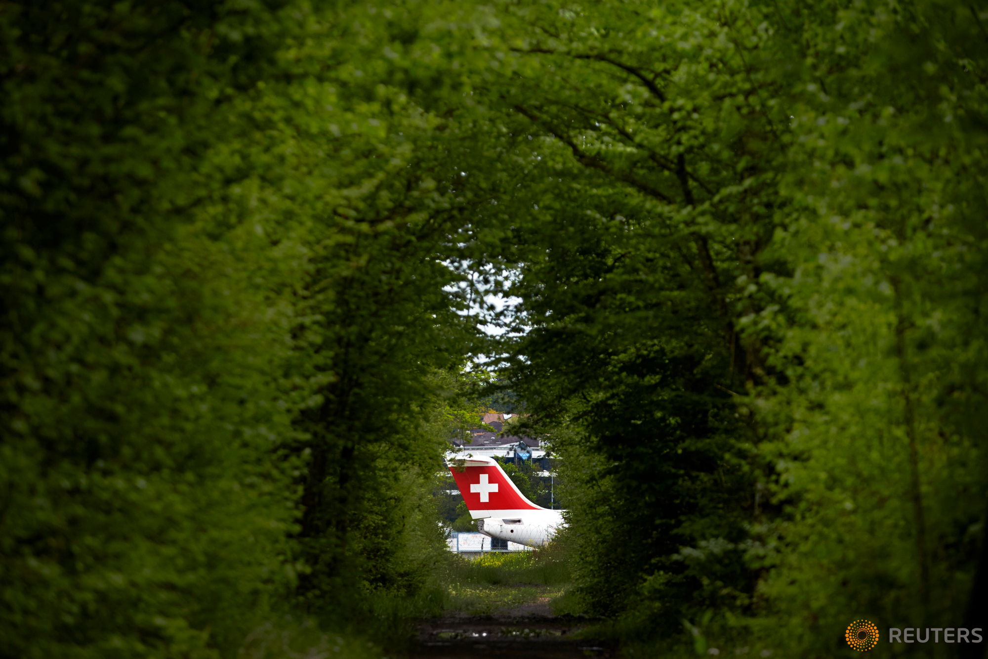 A Swiss aircraft is seen at Cointrin airport on the border with France (front) and Switzerland in Ferney Voltaire near Geneva April 28, 2014. Switzerland will vote on November 30 on an initiative from the group Ecopop which proposes a cap on the number of immigrants. The group says it is motivated by concerns about a lack of living space exerting too much pressure on the land and natural resources, rather than by opposition to foreigners. It proposes limiting immigration to just 0.2 percent of the resident population, equivalent to 16,000 people per year. This would represent a cut of more than 75 percent in annual net immigration from current levels. In Switzerland's system of direct democracy, any voter can trigger a referendum by collecting 100,000 signatures within 18 months. Picture taken April 28, 2014. REUTERS/Denis Balibouse