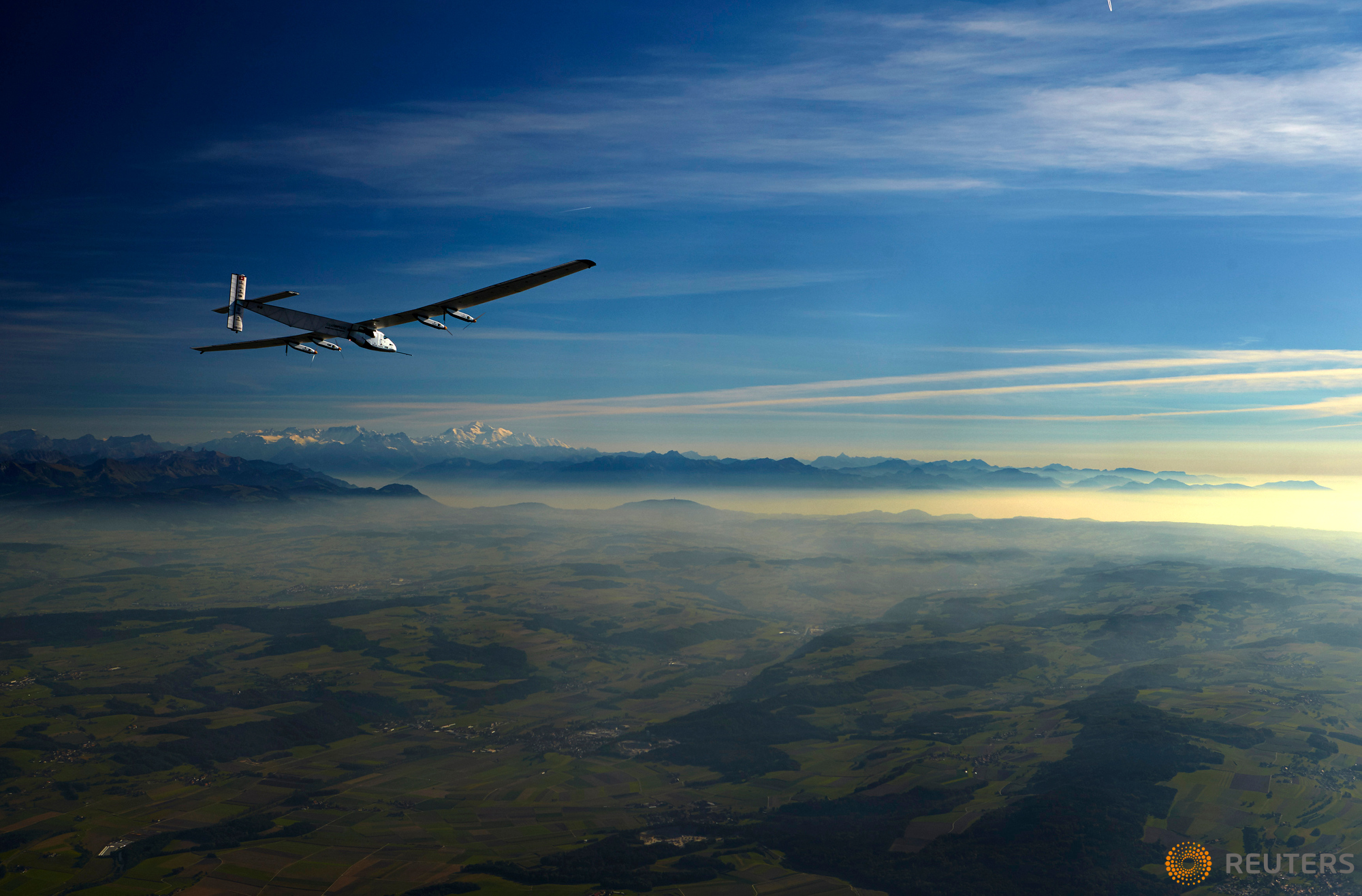 German test pilot Markus Scherdel steers the solar-powered Solar Impulse 2 aircraft during a training flight at its base in Payerne September 27, 2014. The aircraft, which was unveiled April 9, weighs 2.4 tons with a wingspan of 72 meters (236 ft.) and has more than 17,000 solar cells. The attempt to fly around the world in stages using only solar energy will be made from March 2015 starting from Abu Dhabi. REUTERS/Denis Balibouse