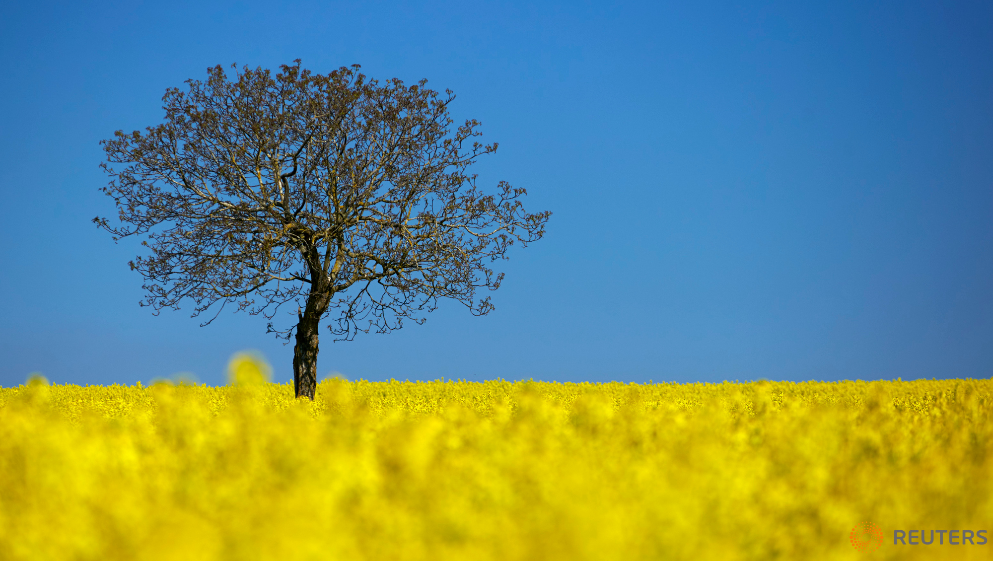 A tree is pictured in a blooming rapeseed field on a spring morning in Vufflens-la-Ville near Lausanne April 23, 2015. REUTERS/Denis Balibouse