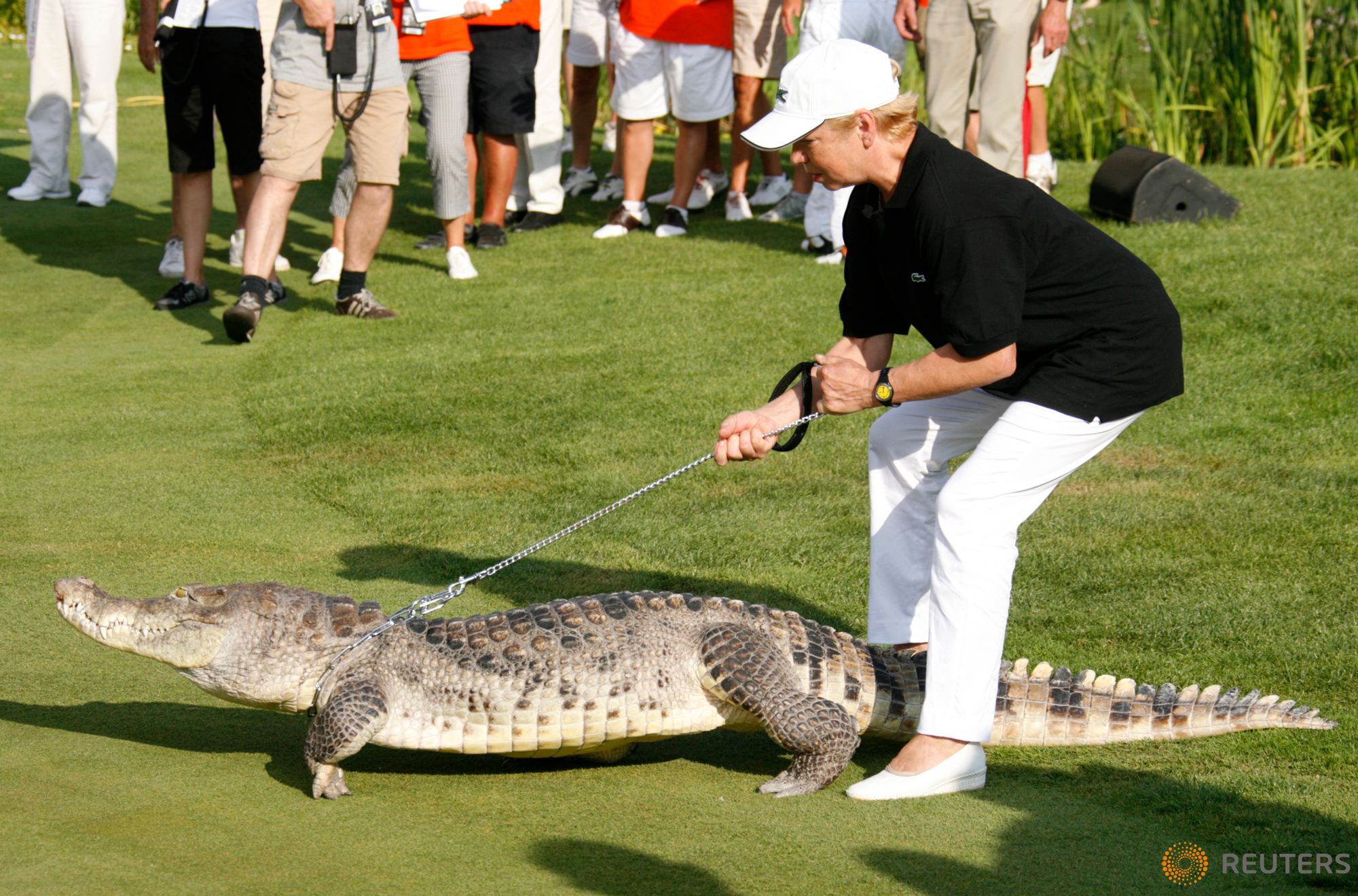 A representative from a clothing brand holds a crocodile on the 18th green during the victory ceremony of the 15th Women's Golf Masters in Evian July 27, 2008. REUTERS/Denis Balibouse